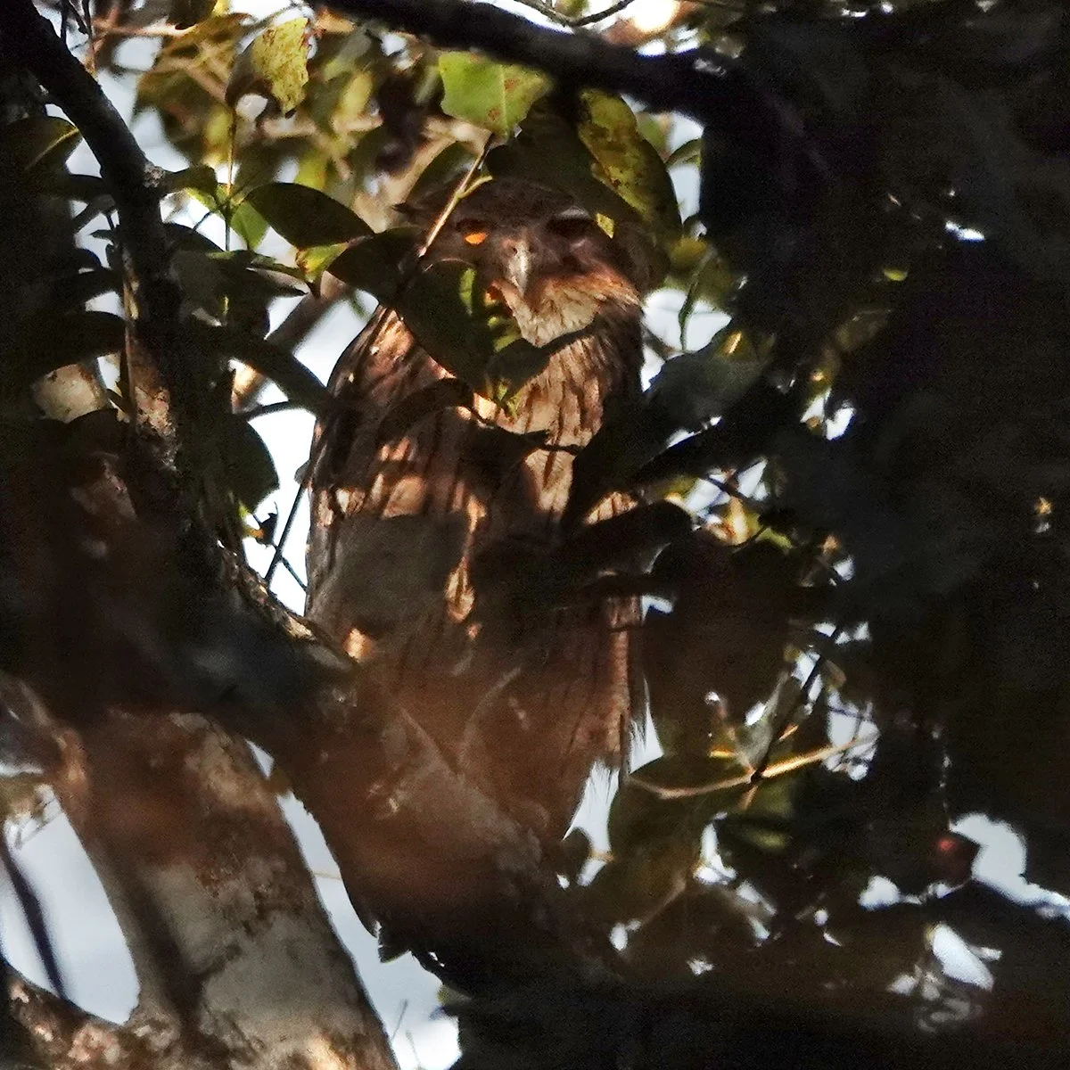 Today, the only clue to its whereabouts was an army of corvids, drongos, orioles, and babblers that was creating such a ruckus, I suspected they were mobbing the large grave-looking predator. I ran up the hill towards the squawking and squealing and saw the owl swoop in an arc northwards into the forest. The smaller birds did not give up the chase, surrounding what looked like a nest high up in a tree.